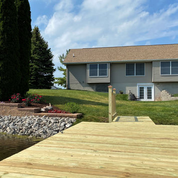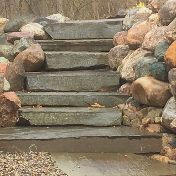 Removed existing wooden deck, designed and installed stone steps, stone patio, flower bed, rock wall, and natural steps leading to pond.